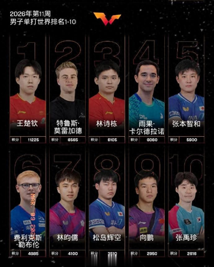 先看几个硬核数字。这周男单前十的座席,王楚钦11225分一骑绝尘,瑞典的莫雷加德窜到了第二。我们的小石头林诗栋,积分是6105分。听起来还可以对吧?但你得望望他死后是谁——巴西的雨果·卡尔德拉诺,6080分。两东说念主就差25分。25分是什么见地?在乒乓球的天下名次体系里,这险些等于一层窗户纸的厚度,一场比赛胜负的事儿 。