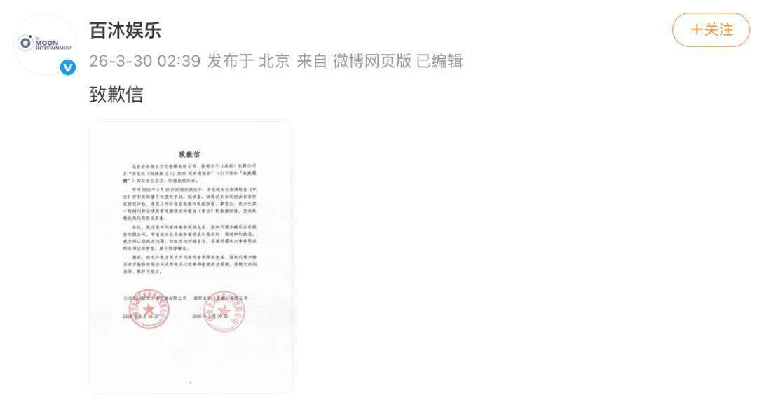 30日凌晨2时许,演唱会聚集主理方北京百沐文娱文化传媒有限公司、阔景音乐(成齐)有限公司发出致歉信。