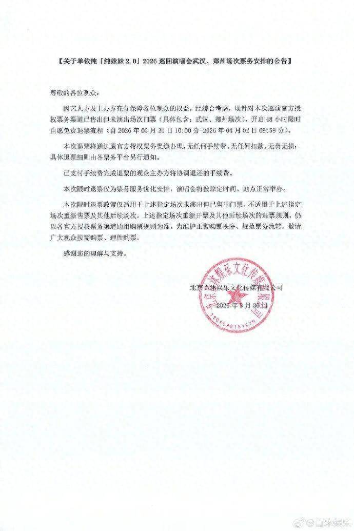 3月30日,单依纯本次巡演的主理方北京百沐文娱文化传媒有限公司@百沐文娱发布公告:经概括有计划,针对@单依纯「纯妹妹2.0」2026巡回演唱会官方授权票务渠谈已售出但未上演场次门票(具体包含:武汉、郑州场次),开启48小时限时自觉免责退票过程(自2026年03月31日10:00—2026年04月02日09:59)。