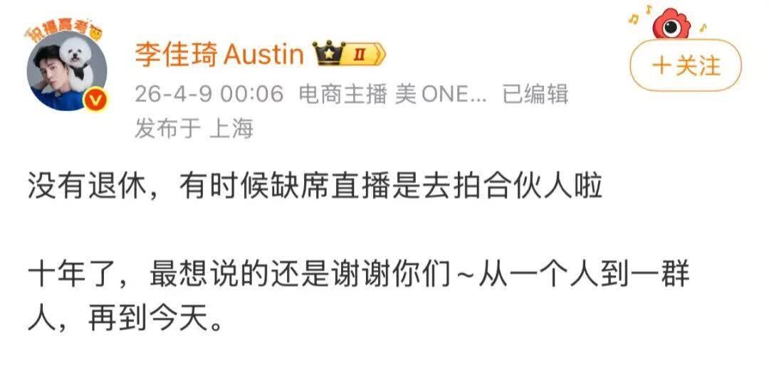 亚博体彩app 李佳琦凌晨否定退休,称4月8日发言口误,缺席直播去拍综艺