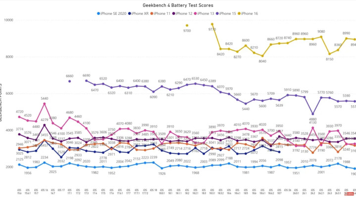 测试用具为 GeekBench 4,共触及 6 款 iPhone。