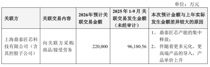 此外,据公告,闻泰科技2026年度与鼎泰匠芯的日常关联交游具体情况为:2026年瞻望关联交游金额为220000万元,2025年1-9月关联交游发生金额(未经审计)为96180.56万元;瞻望金额与上年本色发生金额相反较大的原因为鼎泰匠芯产能的集会开释及伴跟着更多元化、更高端产物的导入,产物单价上升。