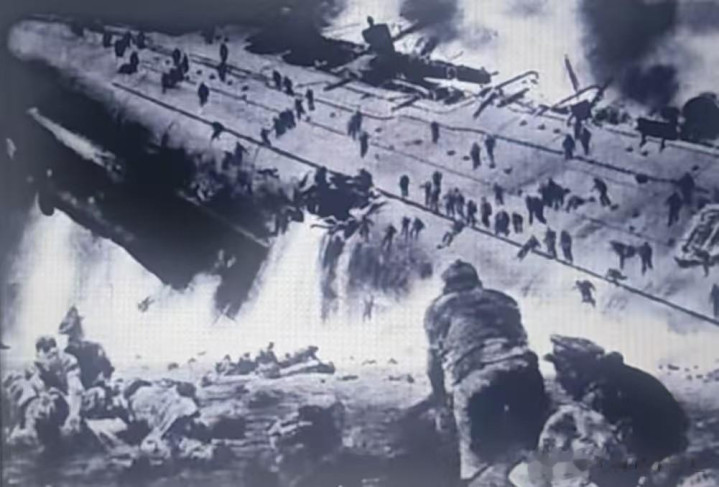 1942年8月8昼夜间,日军舰队突袭瓜岛,重创好意思军舰队,图为弘扬好意思军“昆西”号重巡洋舰倾覆沉没的画作。