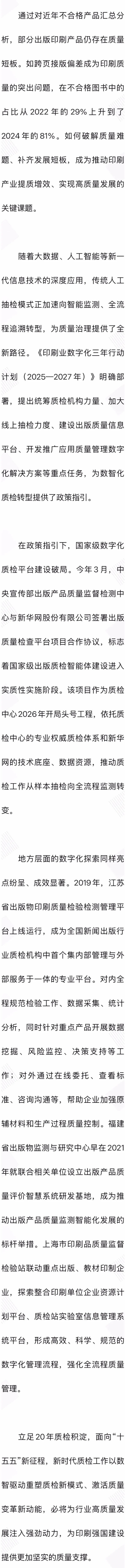 比年来,质料监管进一步向风险防控、数字化、全过程科罚蔓延。2018年起,中央宣传部印刷刊行局开动风险防控的关系使命部署,奉求中央宣传部出书家具性量监督检测中心探索构建针对读者关心、触及健康、尺度不解、隐患凸起的出书家具性量安全问题的追踪监测,尔后更将风险防控使命纳入到每年“3·15”质检活动。2023年《对于加强印刷复制质料科罚的告知》、2025年《印刷业数字化三年行动见解(2025—2027年)》等战略文献,合手续完善质料科罚轨制,晋升印刷质料科罚数字化水平,鼓舞变成质料结实成为自愿、质料变革成为追求、供供水平彰着晋升、竞争才略彰着增强的新地方。