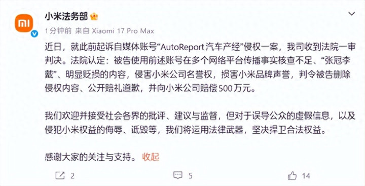 快科技2月25日讯息,日前,小米法务部通报了告状自媒体账号“AutoReport汽车产经”侵权一案的一审判决。