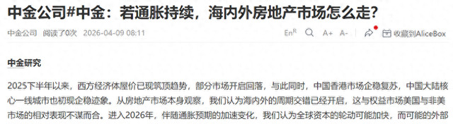 中金公司近日发文称,参加2026年,陪同通胀预期的加速变化,民众成本的轮动可能加速,而可能的外部冲击(通胀+成本流入)对中国房地产市集利大于弊。