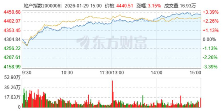 就在今天,房地产开导板块指数涨至4440.51,涨幅达3.15%,