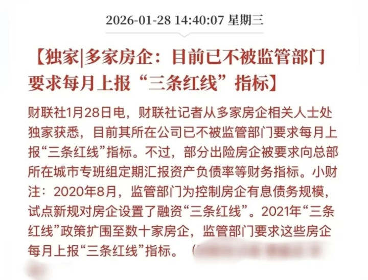 到了2025年底,多家房企接到有关部门理论见知,从2026年起无需再每月上报“三说念红线”有关主意。