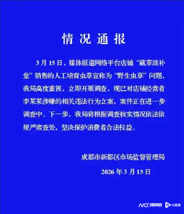 针对“东说念主工培育虫草冒充野生虫草”,成皆市新皆区市集监督照看局官方微信号发布情况通报。