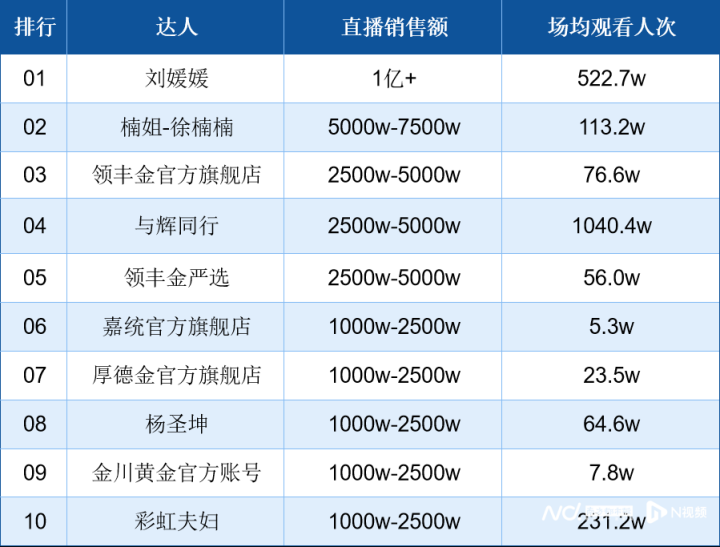 抖音3月16日直播带货日榜:刘媛媛销售额断层特出,达“1亿+”高居榜首;黄金类直播间暴露强势,包括领丰金(官方旗舰店、严选)、厚德金、金川黄金等,占据前十中的四席。